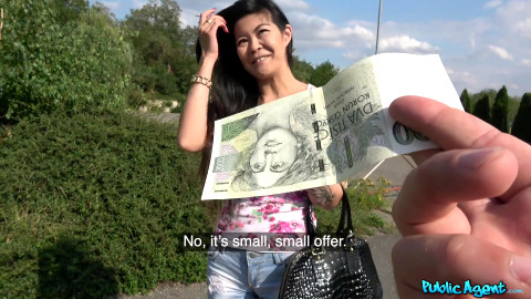 I saw a pretty Asian woman named Akasha Coliun on her phone, and was surprised to find out she spoke Czech! She looked interesting, so I asked her if she was involved in modeling. Akasha worked as a barmaid, so she needed some extra cash. For a hefty sum of crowns, she came to the roadside with me and flashed me her tits and ass. I offered her an additional 10k to suck my dick, and she immediately said yes! I felt up her privates, then she wanked me and gave me a blowjob. I fucked her in the forest, then she wanked me off into her mouth! - "Hot Asian chick loves girthy cock" #publicagent #fakehub