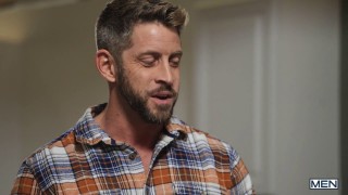 Troye Dean knows the best way to make his new stepbrother, Ryan Bailey, feel welcome... making out with him! The twinks leap apart when Ryan's new stepdad, Johnny Ford, enters, but he just wants to be sure that Troye is showing Ryan around... and when he leaves to make them a snack, Troye shows Ryan's lips the way to his cock. Troye gets inside a chair slipcover and pokes his dick through a hole so that Ryan can ride him as they watch a movie under Johnny's nose. When Johnny conks out, the twinks are free to fuck right out in the open, and they do, first doggystyle before Ryan climbs into Troye's lap and sits on his dick. After pounding his stepbro in missionary, Troye pulls out to cum and licks Ryan's balls as the bottom jacks off... and shoots a load that hits his new stepdad in the head! #mencom