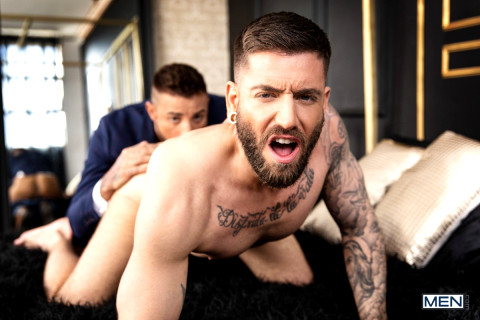 There's nothing hotter than a sharp-dressed man, as Rico Vega realizes while watching his boyfriend Klein Kerr don a crisp white shirt and sharp tailored blazer. Rico rubs his cock, then lets his robe slip off and grinds his ass against Klein's bulge. The top realizes he doesn't have to go out just yet and runs his hands all over his tattooed boyfriend's body, kissing him passionately. Rico unfastens Klein's belt and drops to his knees to suck his cock, then gets on the bed on all fours as Klein rims him. The top lets his shirt fall open as he fucks Rico doggystyle, then sucks the bottom's hard dick. Rico rides Klein reverse, and this passionate couple gaze at each other as Klein fucks his man missionary till Rico orgasms, then pulls out to shoot his hot load on the bottom's abs. - ''Better With Clothes On'' #drillmyhole #men.com