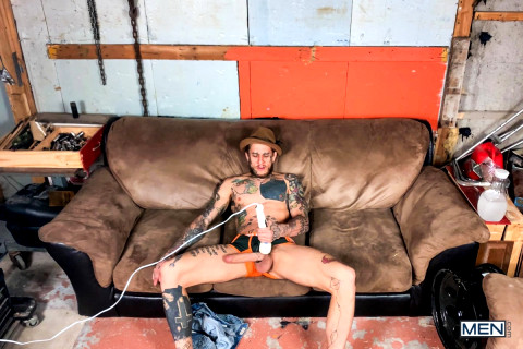 When tattooed stud Bo Sinn finds a huge wand vibrator plugged in and ready to go on the couch, he has to test it out. Bo is impressed with the power, and immediately shucks off his cutoffs to press the toy against his cock through his briefs. Soon he's pulling his huge erection out to experiment with how the vibe feels against every part of his dick, from the head to the base. Bo lubes up his dick and his hole, holding the toy against his meat while fingering his ass, then slips on a cock ring and lies back for an intense jack session as he works two and even three fingers into his hole before he cums. - ''Bo Sinn - Solo'' #bromous #men