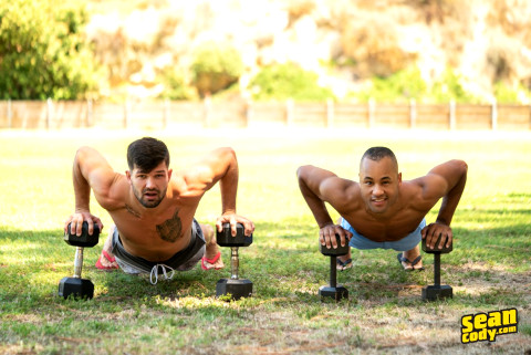 Even while pumping iron in the park, Sean Cody favorite Brysen can't help flirting with the camera, winking as he pecks his impressive biceps. Man's seductive moves work on ebony cutie Chris, because after playfighting and playing with each other's packages, he's raring to go as soon as the athletic studs get some privacy. Chris gets down on his knees to suck Brysen's dick and then hops up to ride it before taking that big dick in doggystyle. Brysen fucks a massive load out of the lean bottom before putting him in piledriver, and even the naughty top can't believe how much Chris's butt can take! "I think he wants more of this. I thought I'd break that hole, but apparently it's a fucking unbreakable hole." - "Brysen & Chris: Bareback" #seancody