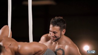 It's Dale's first time trying aerial silks, and his teacher, Dante Colle, is impressed with how well the cute, muscular gymnast does on his first attempt. As Dante corrects Dale's form, the student slips down and ends up with his muscle ass nestled against Dante's swiftly hardening boner! Dale turns around to pull down his coach's leggings and suck it, and Dante rims the bottom. The coach flips Dale upside-down for a vertical 69, then stretches his hole in doggystyle. Dale learns that aerial silks are good for more than just a workout as he lies back and Dante fucks him missionary suspended in midair, then piledriver. Dale cums as he rides the coach's dick, then sucks Dante and swallows his load. #mencom