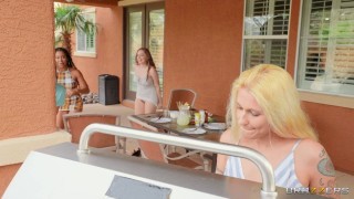 Kira Noir and Van Wylde are new homeowners and they're celebrating by throwing a barbeque to introduce themselves to the neighborhood. Kira, always the badass, has some naughty plans up her sleeve. Starting with gifting Van an apron with big ol’ fuzzy fake dick on it right before his Milf neighbor and her stepdaughter, Mary Moody, arrive. Van tries to conceal his fake cock, the but the Milf can't keep her hands off of it. This gives Kira the perfect distraction and she gets to work seducing her new college gal pal, Mary. Van tries to get Kira to make it more PG but Kira's already cooked up the perfect plan to piss of stepmom that involves scissoring, a double ended dildo and a wand. Kira rips a hole in Van's apron and exposes his actual cock, pushing him back into the hands of Milfie. Like magic, Kira and Mary disappear into the house for a hot and horny lesbian adventure. Now that's hospitality!