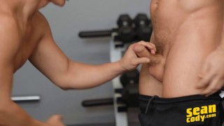 Deacon says "This is giving me good motivation" as he and Dale take turns spotting each other in the gym, doing some pushups and pullups. As Deacon bench presses, he sucks Dale's hard pole. Dale fucks the top's mouth and then bends over the bench for Deacon to rim his hole before he sucks Deacon's big cock. "Oh fuck me," the raven-haired bottom moans as Deacon's tongue penetrates his ass once more, then he gets his wish as Deacon fucks him doggystyle. He rides that dick until Deacon picks him up and puts him on his back on a block, before the guys move to the swing where Dale cums hard. The top rewards him with a nice, long creampie. - ''Deacon & Dale: Bareback'' #seancody