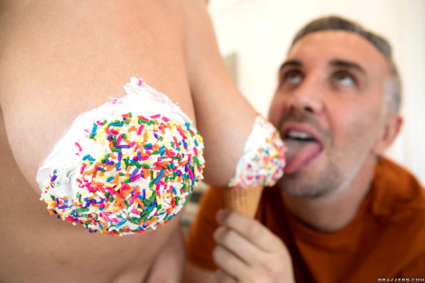 Ella has a sweet tooth. She dips her big boobs in frosting and sprinkles just so she can suck it right off! Keiran wants to get in on the fun, so he takes out some sugar cones to scoop up those sweet tits. - "Sweet Tits" #babygotboobs #brazzers