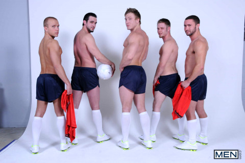 Football players Colt Rivers with Phenix Saint and Rob Ryder , Steve Stifler and Tom Faulk celebrated his victory. - ''Score Part 3'' #jizzorgy #men