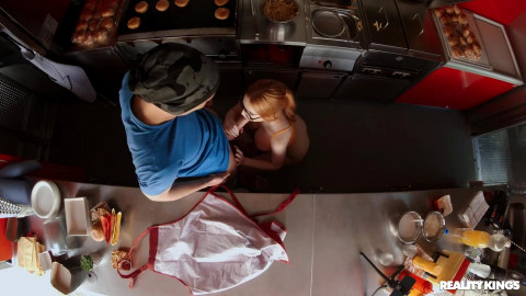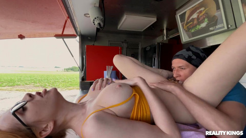 Redhead foodie Scarlett Jones finally achieved her lifelong dream of owning her own food truck. She's got the perfect location and her famous recipes, but she also has a nip slip as one of her big tits falls out of her tank top as she waits for customers! Soon Scarlett is swamped with orders, and luckily her buddy Charlie Dean stops by to help out. After the rush is over, Scarlett thanks Charlie with a blowjob, and he devours her delicious pussy on the counter before slipping her his sausage. Scarlett gets fucked on the counter, then tastes Charlie's special sauce.
