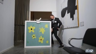 Paul Canon might rather have stayed home to watch the game than come to an art gallery with his girlfriend, but he has a surprisingly profound appreciation for abstract art... especially when security guard Pierce Paris hides inside the pieces and puts his mouth through the glory holes! After a sneaky blowjob, Pierce pokes his cock through another hole for Paul to stroke, and then it's Paul's turn to get into the art and put his ass against the hole so Pierce can fuck it. Pierce rims the bottom and Paul rides him on a bench, then gets fucked doggystyle and missionary. After Pierce pulls out to orgasm, Paul uses the top's jizz as lube as he strokes himself and makes some Jackson Pollock-style art of his own! #mencom