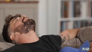 Felix Fox and Chris Damned are watching the big game with their couple friends Kyle Connors and his boyfriend, but when their other halves go to get some snacks at half time, Kyle starts hitting on Chris behind their backs! Felix catches Kyle sucking Chris's cock and shows the interloper how it's done, then Chris sneakily rims Felix. When Kyle's boyfriend returns with the food, the three horny dudes hide under the blanket as Kyle and Felix vie for who will jack off Chris. Kyle's boyfriend makes a trip to the store, and Kyle steals another taste of Chris's cock before sucking Felix as Felix rides his bf. Then Felix sucks Kyle as Chris pounds him doggystyle, and Kyle jacks off as he watches Felix get fucked till the bottom gets covered with all three loads! #mencom
