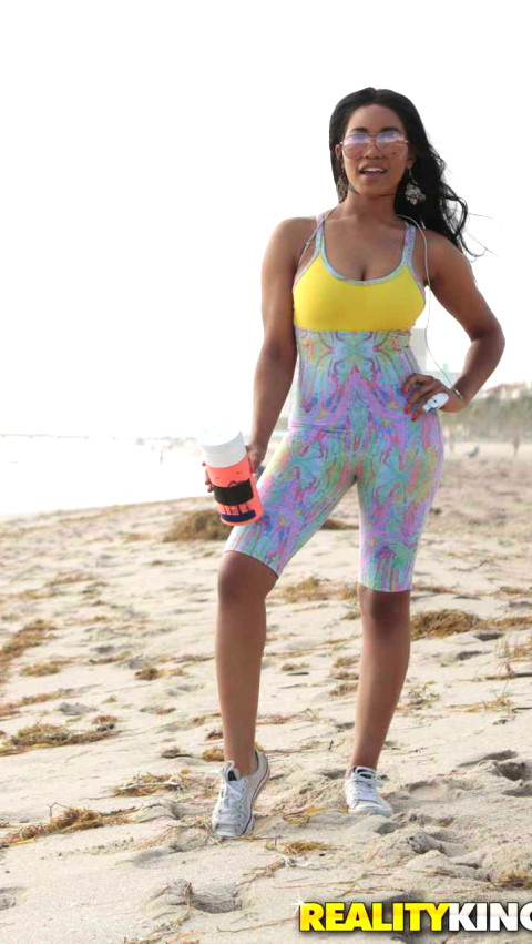 Jenna Foxx has come a long way from Canada, bringing her 36D titties along to shake up the Fort Lauderdale beach. When this sexy ebony gets active, her butt could distract anybody, especially when she jogs and does her yoga – even the tide rolls in to get closer! But Jenna has another admirer – beachcomber Charles Dera! Charles shows Jenna how to do a real workout, putting her through her paces until he decides to cool her off by throwing her in the ocean. Now that Jenna’s cunt is all wet, there is only one solution: oiling her up, ripping off her tights, and letting her warm herself up by titfucking Charles’ dick until his cock is poking in and out of her hungry mouth. Next Charles bends Jenna over for a hard fucking in his shower, with Jenna squealing until Charles cums all over her pretty face and tongue. We do workouts deeper and harder at Reality Kings! - "Working Out With The Kings" #rkprime #realitykings