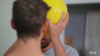 Hetero homeowner Chris Damned is curious about his Homo Renovation, so he sneaks in for a peek. Most of his man stuff is gone, but he finds a box of porn and starts jerking his dick. Host Michael Del Ray spots the horny straight jacking it and quickly gets naked except for a hard hat. In the blink of an eye, Chris is getting his cock expertly sucked by a dude! Chris fucks Michael doggystyle over the couch, and when his wife comes looking for him, Michael doesn't let on that her hubby is laying pipe as he sends her away. The top fucks Michael missionary, then the bottom rides Chris's cock before bending over a sawhorse to get nailed till he cums and take a facial! - ''omo Renovation Part 2: Bareback'' #drillmyhole #men