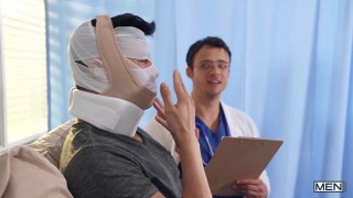 Doctor Nate Grimes can't concentrate on his own patient when hottie Zane Williams is getting a sponge bath from Nurse Michael Jackman just on the other side of the curtain. Nate sneaks over to find Michael giving Zane's cock some special attention. Dr. Nate takes over the handjob, then sucks the patient's cock with his nurse assisting before they line up to eat each other's holes. It's the doctor's turn to get fucked by Zane first, then Michael rides Nate's cock before getting fucked doggystyle by Zane. Nurse Michael then gets to penetrate Dr. Nate till he pulls out and cums, before the sexy nurse takes a facial from both Zane and Nate! - ''Intensive Cum Unit Part 1: Bareback'' #drillmyhole #men