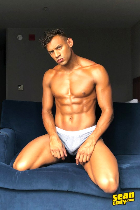 Curly-haired, green-eyed JJ is a dancer originally from Honduras who loves long bike rides and working out his legs in the gym. With his hunky accent, JJ declares, "Sexually, I am into passion. Passion is the key for me." That, and big butts! "That's what I love the most, big butts, bouncy is a big plus as well." JJ's lean yet muscular body is a marvel to admire, and he gives you plenty of time to do just that as he teases you with glimpses of his high, round ass and thick cock before pulling down his briefs. JJ briefly teases his hole as he caresses his form before stroking that cock, giving you lots of close-ups as he shows you a few of his best moves. Watch JJ's pasión come to a climax now. - ''JJ - Solo'' #seancody