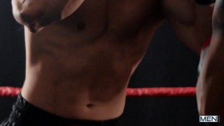 During their pre-fight interview, Malik Delgaty surprises the reporters, managers, and especially his opponent, Trent King, when he leans forward and kisses him on the lips, then takes off his robe to reveal a huge boner tenting his boxing shorts! After Malik delivers a knockdown in the ring, he consoles Trent with his cock in the locker room. Trent sucks the champ's big dick, then Malik fucks him doggystyle. The top lies back on a bench so Trent can ride him, then bends the bottom over against the lockers. Trent takes it deep in missionary lying back on the bench, and in this match he cums first before Malik gives him a facial. - ''Knockdown, Fuckdown'' #drillmyhole #men