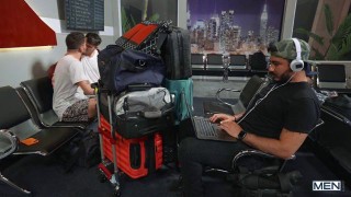 Waiting in the airport is boring, so when couple Chris Damned and Michael Boston get horny, Chris sneakily gets to his knees to suck Michael's dick, observed by the cute gate agent! The employee stands up for a better view when the couple's hijinks get blocked by some luggage, but Michael hides behind the suitcases as his man rims him. The guys get spotted as Michael rides Chris reverse, and when the luggage owner moves away, the gate agent enjoys the show, taking out his cock and jacking it as he watches Chris fuck Michael doggystyle on the floor. It feels so good as Michael rides Chris and grinds on that dick, he begs his man to pound him harder in mish, and soon both guys are cumming! - ''Layover My Dick - Part 1'' #drillmyhole #men