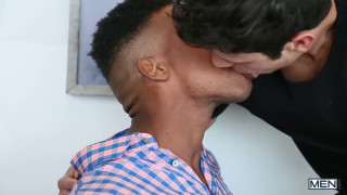 Kaleb Stryker won't rest until he's the top model on Men.com, all he has to do is eliminate all of the competition. When he fakes his way into an interview with prestigious blogger Adrian Hart he's able to pique the keyboard warrior's interest with some juicy gossip about his fellow Men.com exclusives. Kaleb promises to give Adrian the straight-to-streaming fantasy that he's been VODreaming of, dropping to his knees to give Adrian's thick dick a greedy servicing. Adrian makes Kaleb suck his whole dick, the dark-haired twink gagging on its length before he gives Adrian an intense rimjob. Kaleb shows Adrian that he has what it takes to be on top by pounding the ebony hunk with his long, hard cock all over the office, blasting a big load all over the stud's stomach, chest and pierced nipples. - "Fame Whores Part 1" #drillmyhole #men