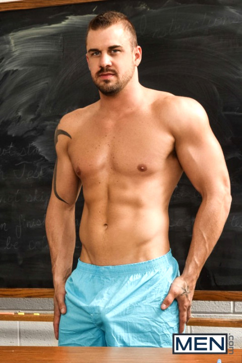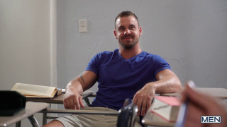 Beefy Darin Silvers and athletic Justin Matthews are sitting in class calmly working on homework. They break the silence to talk and brown-haired Justin explains what he did to get in trouble. Tattooed stud Darin is shocked that all he got was detention so he grabs ahold of Justin bends him over the teacher’s desk and spanks his butt. Darin tells him that he gives him the punishment that he deserves, and Justin likes it so much that he will forgive it again and again. - ''The Disciplinarian'' #bigdicksatschool #men