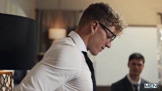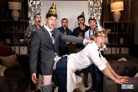 After Paul Canon sucks his boyfriend, Finn Harding's cock at a New Year's Eve party, he doesn't want to spill a drop on either of their immaculate suits, so he spits the load into a glass of bubbly, much to the chagrin of cute caterer, Felix Fox, who swallows it up to make sure it doesn't go to waste! When Felix splits his pants, gentlemanly Finn helps him hide it by standing behind him, but soon gives in to temptation, fingering the blond twink's hole and fucking him doggystyle! When Paul catches his man rimming the caterer in another room, he pops a bottle to turn this party into a fuckfest, covering them in bubbles before taking his turn licking the twink's hole. Felix sucks both cocks, then gets pounded by Paul as he swallows Finn's big dick. Paul rides his bf as the twink feeds him his cock, then Felix gets double penetrated by both guys at once! Paul cums as he rides Felix's cock, then Finn makes the hot caterer blow his load as he pounds him in missionary, then pulls out to cum all over him. - ''New Years Sleaze Part 1'' #drillmyhole #men