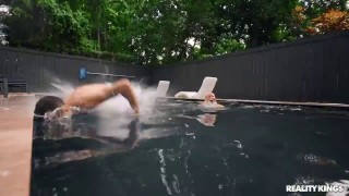 After curvy redhaired babe Aria Kai's bf catches her hooking up with their nosy neighbor in the hammock, he chases Johnny the Kid away, but Johnny sneaks back with his stacked gf Carmela Clutch later to use the pool! Aria catches them sneakily swimming while she's looking for her sex toy, and ends up showing Carmela how to ride it before scissoring with the horny brunette poolside as Johnny watches. Johnny gets in on the action, as Aria and Carmela slobber all over his big cock before they share his dick and lick each other's pussies! - ''Nosy Neighbor, Hammock Shaker Part 2'' #rkprime #realitykings