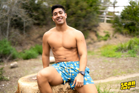Dark-haired newbie Paco takes his shirt off and shows off both his muscular chest and his handsome smile before his solo. Paco's not shy about flashing his ass outdoors before he heads to the studio and bares it all. He teases his nipples and sniffs his pits, caressing his taut body and stroking his hard cock. Paco kneels and reaches back to tease his hole, then humps a pillow before he lies back, jacking his dick with one hand and fingering his ass with the other. Paco finishes things off by tasting his thick load! #seancody