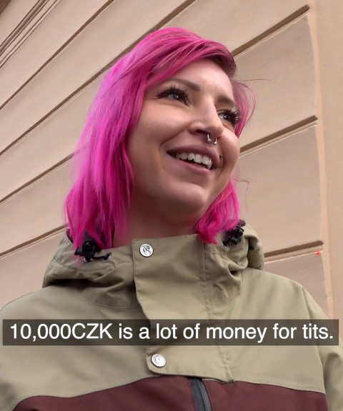 I saw pink-haired Alex Bee standing on the side of the road near this club, and she was sexy, so I told her I was looking for models. Alex told me she had a boyfriend, so she could not do any nudes without asking him, but when I proposed her 4000 CZK to see her tits, she happily flashed me. For another 4000 CZK, Alex showed me her ass, then I asked how much it would cost for her to suck cock. She took me into the club and sat me down, took her tits out, and gave me an amazing blowjob. As she sucked my cock, I could tell she was hungry, and asked if she wanted it in her pussy. Alex was horny, so she took her pants off, then climbed on my cock. I fucked her tight pussy all over the club, then she wanked me off onto her tits. - "Hardcore fuck in a strip bar" #publicagent #fakehub