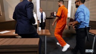 Deviant Chris Damned is led to court in chains, accused of sticking his dick through a painting. Cockspert witness Felix Fox arrives, confident that he'll prove Chris's guilt beyond a shadow of a doubt, but ends up proving Chris was falsely accused! To apologize, Felix sucks Chris's cock, then Chris bends Felix over, pulls out his butt plug, and fucks his hole. The bottom asks Chris to unlock his cock cage, then the top fucks him missionary, and Felix rides Chris on the judge's box! Chris fucks the expert bottom doggystyle till Felix cums, then accepts his apology with a facial. - ''Pleading Horny'' #drillmyhole #men