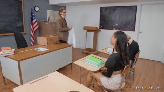 Making her Brazzers debut, Ali Cash is late for Professor Mick Blue’s big exam, and all eyes are on her big natural tits popping out of her skimpy top the moment she enters the class. Mick doesn’t approve of her wardrobe and hands her a blouse to change into instead, but guess what? It can barely contain her titties either! Once her classmates are done taking their exam Ali confronts Mick, questioning his intentions in giving her such a tight blouse to wear in school. So, she gives him what she thinks he really wants, flashing her boobs and tempting him into giving her what she wants: his big hard cock and a hardcore fucking in the classroom!
