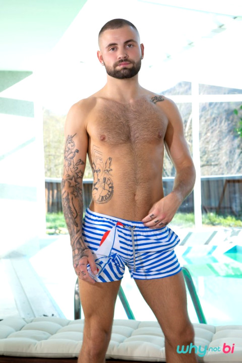 Katy Rose and her husband Thomas Friedl have just gotten a new pool boy, the hunky Jeffrey Lloyd and they can't wait to break him in. Katy gets the pool boy to come over and lotion up her shoulders and back, inviting him to run his hands all over her stunning body. Jeffrey cannot control himself and starts jacking off while he's alone with Katy, which is exactly what Thomas wants to see when he comes in to check on them. The barrel-chested stud grabs the athletic pool boy and coaches him through a hot and wet bisexual three-way by the pool. - ''Pool Boy Toy'' #whynotbi