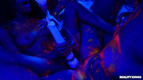 It's the morning of the final day in the Project DTF house, so resident chef Oliver Flynn is in the kitchen making cinnamon rolls, while Diamond Banks busts in on Gizelle Blanco and Scarlit Scandal for a little pussy eating in the bedroom, and outside, Damon Dice and Mila Monet are fucking in the obstacle course. When Air Thugger comes upstairs to pound Gizelle's pussy, Scarlit heads outside to steal Damon away to suck him and get dicked down in the bounce house! After the delicious breakfast, Roxie Sinner rewards Oliver with a nice, lubed-up massage, then rides him till he cums on her big tits. The pornstars head outdoors for some fun in the sun, including a penis pinata, and after dark, they paint each other all over with glow paint for a black light orgy that ends with the guys painting the girls' faces with cum! It's always hard saying goodbye, but the Project DTF memories are sure to last a lifetime.