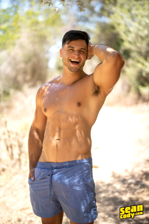 Muscular, handsome first-timer Axel is a natural as he shows off his broad chest and his dimples outside. Axel's not shy to get playful and flirtatious as he hikes the trail, even pulling his shorts down to show his muscle ass and shake his dick around. In the studio, you'll be eager to follow his thick treasure trail down into his shorts, and Axel's ready to undress and show his rock-hard boner as he strokes his cock, slapping it against his palm and fucking his hands before displaying an impressive first-time cumshot. - ''Axel'' #seancody