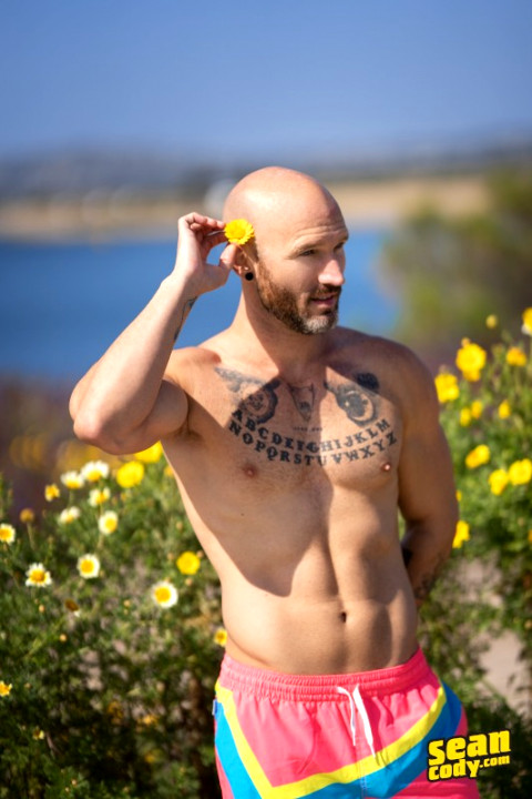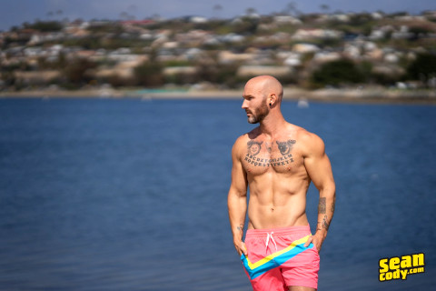 Shaven-haired, muscular Vin hits the beach, jogging along the boardwalk and riding his scooter down the road. This bearded, inked hunk likes to get playful as he rubs his bare chest, plucking a blossom and tucking it behind his ear. When Vin returns to the studio, he shows his sensual side, caressing himself all over as he unzips his hoody and lets his hands play over his muscled chest and abs. Even during his solo, Vin loves to dirty talk through the action, and when he pulls down his shorts to let his massive, hard cock out, things really heat up. Vin spits on his hardon and strokes it, describing just how he wants to fuck, till he shoots a load all over his abs and rubs it in. - ''Vin - Solo'' #seancody