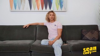 Where else could a golden-haired Adonis like Shawn hail from but California? As Shawn describes his very rigorous workout routine, you'll know that a perfect body is waiting under his casual jeans and t-shirt, but don't miss what this hunk says about his tastes in the bedroom! "When it comes to sex, I'm definitely more of a Dom top--No, I'm kidding," he says with a laugh. "I like to get fucked. Big-dick bottom is kind of my thing." You won't want to look away for a second as Shawn strips off his clothes and strokes his impressive cock, teasing his hole with his fingers. Shawn stands in the mirror as he jacks his cock, then lies back in piledriver pose till he blows a huge load all over himself. We can't wait for him to be back! #seancody