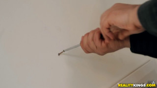 Antonio Ross is frustrated to yet again hear his upstairs neighbor banging away with a hammer. He hurries upstairs to give them a piece of his mind, but is surprised to see a sexy teen named Sicilia who needs help hanging a framed picture. She drags him inside, and climbs up the ladder to try again, giving him a long look up her skirt as she adjusts the frame. Antonio's got a sneaky suspicion that this hot blonde is actually just in some serious need for some dick--which is why she's probably doing all of that banging! When they finally get it straight, Sicilia is so overjoyed, she shows her thanks by fucking Mr. Ross right there in her living room! This sexy slut sucks his dick like a pro as Antonio manhandles her, flipping this flexible chick in all sorts of sexual positions that show off her beautiful butt and sweet perky boobs! How's it hanging? Well, just ask this cock slut what she thinks! - "Hows It Hanging" #mikesapartment #realitykings