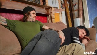 Emo Edward Terrant likes watching skater Bo Sinn do tricks in his basement, but when he gives it a try, he wipes out. In frustration, the emo breaks the board, so Bo gives the misbehaving bottom an over-the-knee spanking. Edward asks for it harder, and when Bo rips open his jeans, he finds the twink has a plug in his ass! The top feeds Edward his cock, then fucks him doggystyle. Edward loves taking that dick deep, and Bo pulls off the emo bottom's jeans, then fucks him mish on the couch before breeding his hole as Edward rides him! - ''Sk8ter Boyz'' #bromous #men