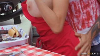 The sexy Azul Hermosa is hosting a 4th of July BBQ for some of her colleagues. Some of her workmates (including Scott Nails) show up to the party and are shocked to see Azul cooking up some food while wearing nothing but an apron. While the other coworkers leave in shock, Scott's more than happy to play along with the clothing-optional event. It's not long before metaphorical fireworks go off between the hot pair and their fucking each other in the yard. - ''Sucking His BBQock'' #brazzersexxtra #brazzers