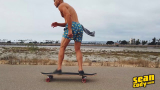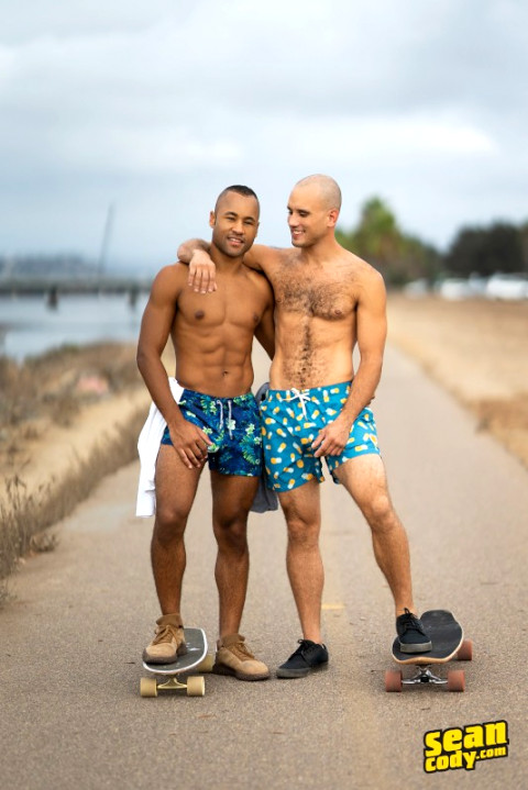 What better way to admire a hot guy's bod and feel the wind in your hair (or across your scalp) than by hopping on your skateboard? That's just how this pair of shaven-headed cuties start their scene! After ebony hunk Chris gives dreamboat Frankie a peek at his cock out the leg of his colorful shorts as they chill at the park, the boys head back for some privacy at the studio, where they strip down and Frankie grinds against Chris's pert ass before Chris sucks Frankie's cock. Chris bends over to get fucked doggystyle, then moans "Take that hole" as Frankie fucks him in piledriver. "Fuck, look at that," Frankie pants as he watches Chris cum before adding man's own massive load. - "Frankie & Chris: Bareback" #seancody