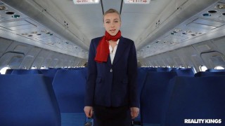With her perfectly coiffed hair, tailored uniform, and jaunty scarf, blonde French flight attendant Angel Emily inspires naughty fantasies as she gives the pre-flight information to her passengers, like seeing her let her hair down in a very different kind of uniform: black leather designed for bondage. Angel Emily will put your cock in the upright position as she gets fucked with a vibrator and gets ready for takeoff with a big dick in all her exits. - ''Takeoff And Landing'' #lookathernow #realitykings