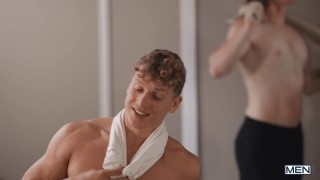 It's Felix Fox's first time working with his new trainer, and he really puts the sweaty twink through his paces! When the trainer's next client, Dante Colle, shows up, Felix is impressed by the bearded hunk's muscles and stamina, and asks his trainer for details about him. Dante eavesdrops outside the locker room, then comes inside to offer Felix some tips... and more than just the tip! Dante rims the bottom, then sucks his cock before fucking Felix bent over a bench. Felix deepthroats Dante, then rides him. Dante pounds the bottom in doggystyle, then penetrates him in missionary till Felix orgasms, and the bottom eagerly takes a facial. #mencom
