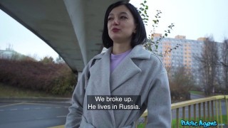 I stopped this raven-haired stunner named Madison Quinn in the street today. After giving the sexy babe 100 euros, she was happy to introduce herself and answer a few questions. Despite being shy, the Russian hottie confided that she had recently split from her boyfriend and lived alone, so I offered her more money to flash me her small, perky tits and let me play with them. Feeling horny, I invited Madison back to my studio for a blowjob, then I face fucked the petite slut! The feel of my thick cock in her mouth was a turn-on, so Madison stripped off and sat her wet pussy down on it. After riding me in cowgirl, the pierced nymph spread her slender legs and took a missionary-style pounding, then I spanked her tight, firm arse as she bounced on my dick in reverse. I put Madison on her knees and banged her in doggy position till I was close to cumming, then I pulled out to shoot a sticky load in her mouth! - ''The Quiet Little Russian'' #publicagent #fakehub