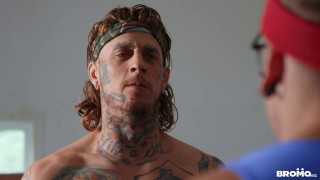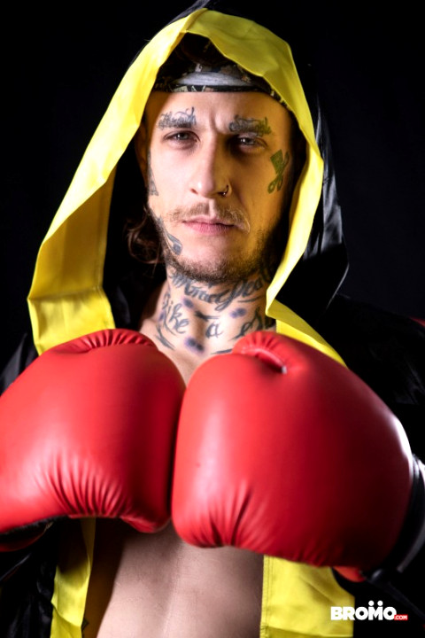 Harvey Sid gets pushed into the ring against ultimate fuck champion Bo Sinn, but he's shaking too hard to throw a punch, and even wets himself! Bo refuses to fight in his mess, so Harvey suggests they do something else instead, dropping to his knees to suck the champ's prize-winning cock. Bo puts the bottom up against the ropes and fucks his throat, then bends him over for doggystyle. Harvey does a shoulderstand as Bo delivers a piledriver, then Bo puts the bottom on his back for the main event missionary until Harvey cums. Bo gives the bottom a facial before delivering some words of advice for the next match! - ''Ultimate Fuck Champion'' #bromous #men