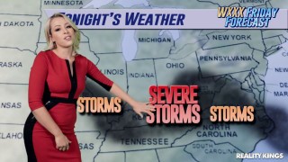 Pretty blonde meteorologist Zoey Monroe has some bad news: this is a good weekend to stay inside, because it's going to be hot, humid, and wet. Luckily, staying in with hot, wet Zoey is a whole lot of fun! As Zoey announces the Friday Forecast with a chance of showers, watch her shower Michael Vegas's face with squirt. She warns of a low pressure system sliding in, and Michael slides his cock into her pussy. This morning is already off to a hot start! - ''Wet and Sticky Weekend'' #lookathernow #realitykings