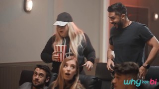 As Dante Colle puts his cock through the popcorn bucket for his girlfriend, Haley Reed, to touch, the sexy stranger sitting behind him notices and decides to get in on the fun. Malik Delgaty sticks his hand through the back of the chair and fingers Dante's hole till he cums. When Dante leaves for the bathroom, he takes Dante's seat and puts Haley's hand on his cock! Haley doesn't notice she's jacking off a stranger until Dante comes back and sits on her other side. She decides to stroke both dicks, then the threesome get naked. Dante sucks Malik and the guys take turns fucking Haley's mouth and her pussy. Then Haley rides her boyfriend's cock as he rides Malik, then sits on Dante's face as the top pounds him missionary before taking both guys' loads in her mouth! - ''CineCum'' #whynotbi